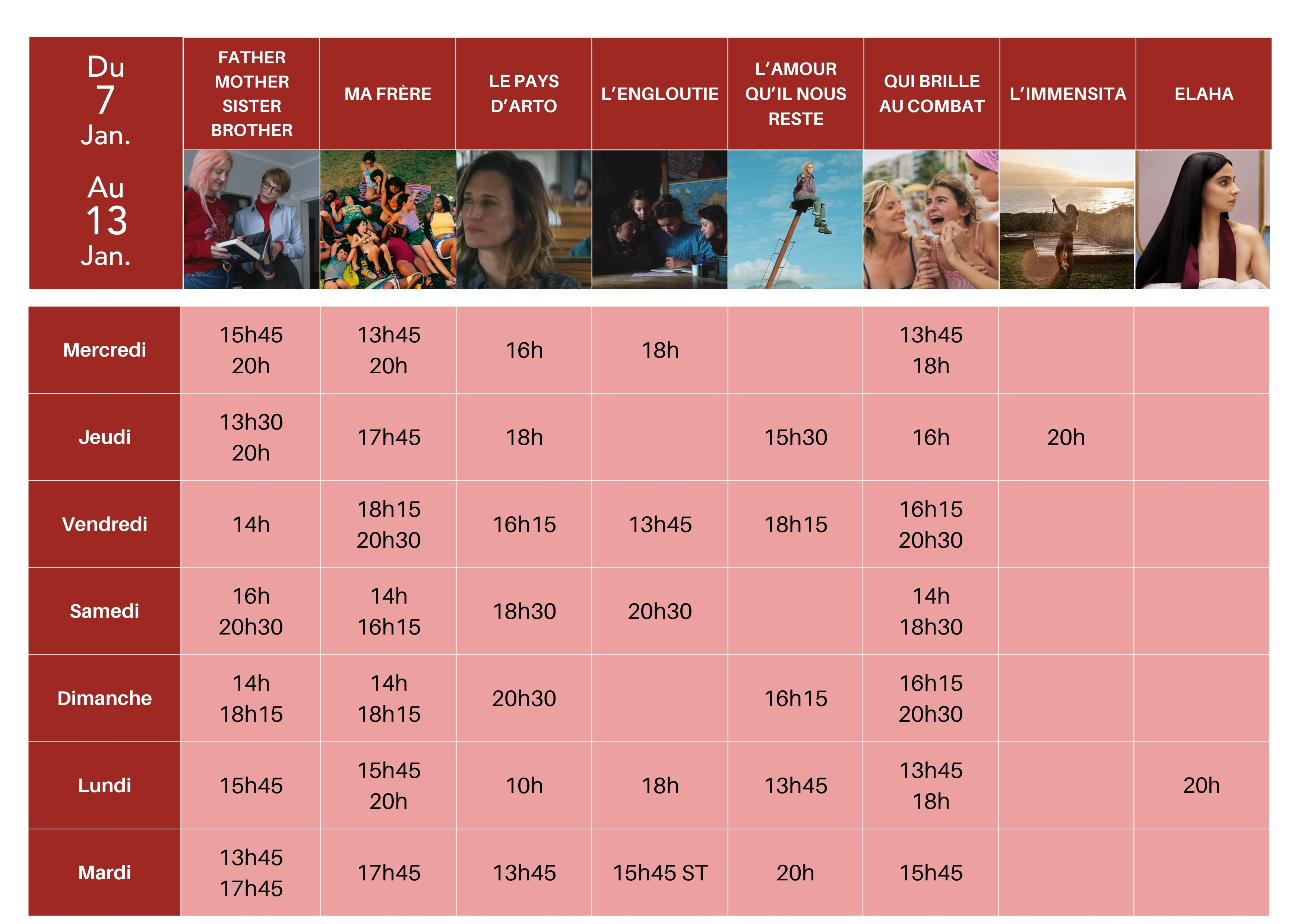 mar. 13 janvier 13:45 FATHER MOTHER SISTER BROTHER – VOST 13:45 LE PAYS D'ARTO – VOST 15:45 L'ENGLOUTIE – VFSTF 15:45 QUI BRILLE AU COMBAT 17:45 MA FRÈRE 17:45 FATHER MOTHER SISTER BROTHER – VOST 20:00 L'AMOUR QU'IL NOUS RESTE – VOST mer. 14 janvier 13:45 L'AFFAIRE BOJARSKI 15:00 JACK ET NANCY - LES PLUS BELLES HISTOIRES DE QUENTIN BLAKE 16:00 FATHER MOTHER SISTER BROTHER – VOST 16:45 L'AGENT SECRET – VOST 18:15 UNE ENFANCE ALLEMANDE : ÎLE D'AMRUM, 1945 20:00 MA FRÈRE 20:00 L'AFFAIRE BOJARSKI jeu. 15 janvier 13:30 MA FRÈRE 15:30 MA FRÈRE 15:45 FATHER MOTHER SISTER BROTHER – VOST 17:45 FATHER MOTHER SISTER BROTHER – VOST 17:45 L'AFFAIRE BOJARSKI 20:00 CARAVAGE - EXPOSITION – VOST 20:00 L'AFFAIRE BOJARSKI ven. 16 janvier 13:30 L'AFFAIRE BOJARSKI 15:45 L'AGENT SECRET – VOST 16:15 MA FRÈRE 18:30 FATHER MOTHER SISTER BROTHER – VOST 18:45 UNE ENFANCE ALLEMANDE : ÎLE D'AMRUM, 1945 20:45 MA FRÈRE 20:45 FATHER MOTHER SISTER BROTHER – VOST sam. 17 janvier 14:00 CARAVAGE - EXPOSITION – VOST 14:00 MA FRÈRE 16:00 L'AFFAIRE BOJARSKI 16:15 UNE ENFANCE ALLEMANDE : ÎLE D'AMRUM, 1945 18:15 MA FRÈRE 18:30 FATHER MOTHER SISTER BROTHER – VOST 20:30 L'AGENT SECRET – VOST 20:45 L'AFFAIRE BOJARSKI lun. 19 janvier 13:30 MA FRÈRE 13:30 FATHER MOTHER SISTER BROTHER – VOST 15:45 FATHER MOTHER SISTER BROTHER – VOST 15:45 L'AFFAIRE BOJARSKI 17:45 MA FRÈRE – VFSTF 18:00 UNE ENFANCE ALLEMANDE : ÎLE D'AMRUM, 1945 20:00 PALOMBELLA ROSSA – VOST 20:00 L'AFFAIRE BOJARSKI mar. 20 janvier 10:00 MA FRÈRE 13:45 L'AFFAIRE BOJARSKI 13:45 UNE ENFANCE ALLEMANDE : ÎLE D'AMRUM, 1945 15:30 MA FRÈRE 16:15 L'AGENT SECRET – VOST 17:45 FATHER MOTHER SISTER BROTHER – VOST 20:00 DIS-MOI SUR QUEL PIED TU DANSES 20:00 FATHER MOTHER SISTER BROTHER – VOST mer. 21 janvier 13:30 LA TRILOGIE D'OSLO : AMOUR – VOST 13:30 L'AFFAIRE BOJARSKI 15:45 VALEUR SENTIMENTALE – VOST 15:45 LE MAGE DU KREMLIN – VOST 18:15 NINO 18:30 MIROIRS N°3 – VOST 20:15 L'AFFAIRE BOJARSKI 20:15 LE MAGE DU KREMLIN – VOST jeu. 22 janvier 14:00 JE SUIS TOUJOURS LÀ – VOST 14:00 LE MAGE DU KREMLIN – VOST 17:00 VALEUR SENTIMENTALE – VOST 17:00 L'AGENT SECRET – VOST 20:00 L'AFFAIRE BOJARSKI 20:00 LE MAGE DU KREMLIN – VOST ven. 23 janvier 13:30 L'AGENT SECRET – VOST 13:30 LE MAGE DU KREMLIN 16:15 LA TRILOGIE D'OSLO : AMOUR – VOST 16:30 L'AFFAIRE BOJARSKI 18:30 PARTIR UN JOUR 18:45 UN SIMPLE ACCIDENT – VOST 20:30 L'AFFAIRE BOJARSKI 20:45 SIRÂT – VOST sam. 24 janvier 13:45 VALEUR SENTIMENTALE – VOST 13:45 LE MAGE DU KREMLIN – VOST 16:15 L'AFFAIRE BOJARSKI 16:30 UN SIMPLE ACCIDENT – VOST 18:30 NINO 18:30 L'AFFAIRE BOJARSKI 20:30 L'AGENT SECRET – VOST 20:45 LE MAGE DU KREMLIN dim. 25 janvier 14:00 PARTIR UN JOUR 14:00 L'AFFAIRE BOJARSKI 16:00 LE MAGE DU KREMLIN 16:15 MIROIRS N°3 – VOST 18:00 JE SUIS TOUJOURS LÀ – VOST 20:15 L'AFFAIRE BOJARSKI 20:30 UN SIMPLE ACCIDENT – VOST lun. 26 janvier 13:30 L'AFFAIRE BOJARSKI 13:30 LE MAGE DU KREMLIN 15:45 PARTIR UN JOUR 17:45 SIRÂT – VOST 17:45 L'AFFAIRE BOJARSKI – VFSTF 20:00 LE MAGE DU KREMLIN – VOST 20:15 JE SUIS TOUJOURS LÀ – VOST mar. 27 janvier 13:15 SIRÂT – VOST 13:30 MIROIRS N°3 – VOST 15:15 NINO 15:30 L'AFFAIRE BOJARSKI 17:15 LE MAGE DU KREMLIN – VOST 17:45 LA TRILOGIE D'OSLO : AMOUR – VOST 20:00 LE GÂTEAU DU PRÉSIDENT – VOST 20:00 LE MAGE DU KREMLIN mer. 28 janvier 20:00 LA THÉORIE DU BOXEUR jeu. 29 janvier 20:00 LE TERRORISTE – VOST ven. 30 janvier Pas de séance sam. 31 janvier Pas de séance dim. 1 février Pas de séance lun. 2 février 20:00 UN ÉTÉ CHEZ GRAND-PÈRE – VOST mar. 3 février 20:00 CINÉ SURPRISE mer. 4 février 15:00 LES TOUTES PETITES CRÉATURES 2 20:00 LA DÉPOSITION jeu. 5 février 20:00 LE GÂTEAU DU PRÉSIDENT – VOST ven. 6 février Pas de séance sam. 7 février Pas de séance dim. 8 février 10:30 LES TOUTES PETITES CRÉATURES 2 lun. 9 février Pas de séance